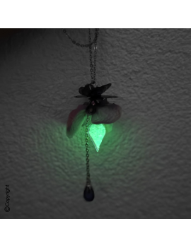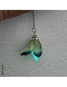 ✨ This creation is adorned with a flexible fairy wing and a glass vial containing phosphorescent powder covered with fabric flower petals.