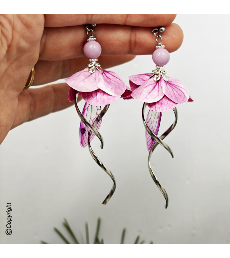 ✨ This creation is adorned with a flexible fairy wing and phosphorescent pearls covered with fabric flower petals.